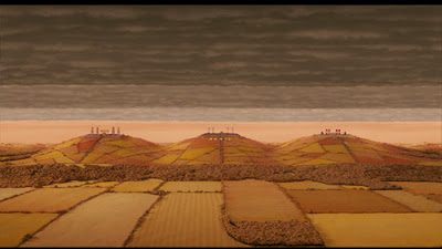 If we look at this still from Fantastic Mr. Fox (above) we perceive the upper part of the sky as gray in contrast to the salmon lower part and the orange-brown landscape. The gray clouds also serve as a balance to the rest of the picture preventing it from looking monochrome (more about this in the final Mr. Fox post).
